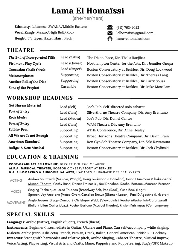 Theater I am a Lebanese born Actor, Writer, and Singer. I am fluent in English, French, and Arabic. I studied Musical Theater at Boston Conservatory and Berklee College of Music and I am based out of New York City. Contact Send me a Message Name Email Address Phone Number Message Submit